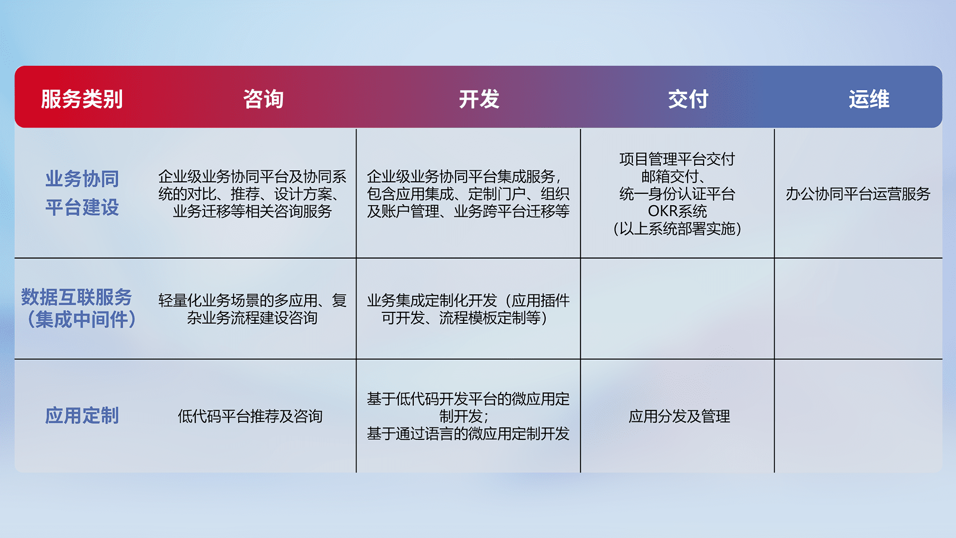 针对钉钉、、、、企微、、、IDaas等平台级产品提供产品的规划、、、、方案、、、、交付、、、、定制化开发等服务,,实现如统一协同办公、、、、智能客户服务、、混合会议管理、、、智能数据查询、、、、等业务场景,,实现数字化转型。。